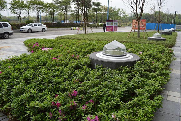 绿化带中可见多套光导照明系统,这是室外的采光罩,照进室内的光线就是通过这一个一个光滑透亮的采光罩收集的,独特的隔离紫外线和红外线功能保证了室内光线的舒适和安全。